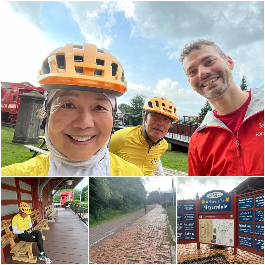 我身体完全适应。骑到Meyersdale这座孤零零的山村小镇,下雨了。在旧火车站改建的博物馆门廊下躲雨,偶遇了几批骑行者。小年轻Sam一个人骑车绕东部一圈,我问他怎么有时间的?他说想骑了就辞了工!他羡慕我们,我们还羡慕他呢。