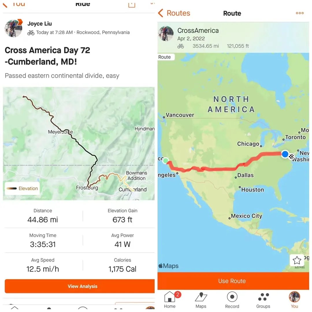这里也有历史故事,明天上午离开之前我们会去小镇逛逛。今日骑行记录:61迈往东南方向,深色的路线是爬升大的路段(下图左)。这里也是猫哥2014年骑行路过的地方!我们上Strava查记录,可不是吗?交汇点就在旅馆外面的路口(下图右)。